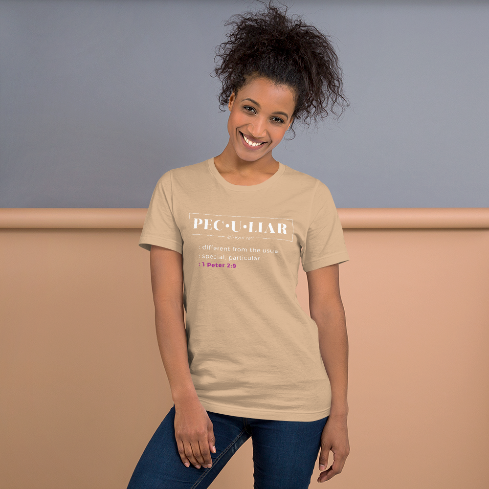 1 Peter 2:9 calls Christians a "peculiar" people. You are God's special possession for a divine purpose. Proclaim your unique identity with this statement tee!